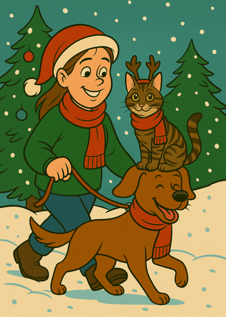 Whether you have a dog, cat, bunny, or a whole furry family, I transform your pet into a heartwarming cartoon character — complete with optional festive touches like scarves, Santa hats, antlers, or cozy winter accessories.