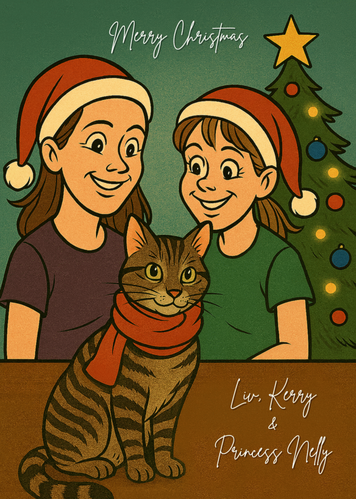 At Kerry’s Keepsakes, every holiday card is lovingly illustrated in our signature smooth retro-cartoon style — warm, clean, expressive, and full of that cozy nostalgic magic you remember from 90s holiday specials. These cards are designed to feel personal, joyful, and delightfully sentimental… the kind you’ll want to keep on the fridge long after the season ends.